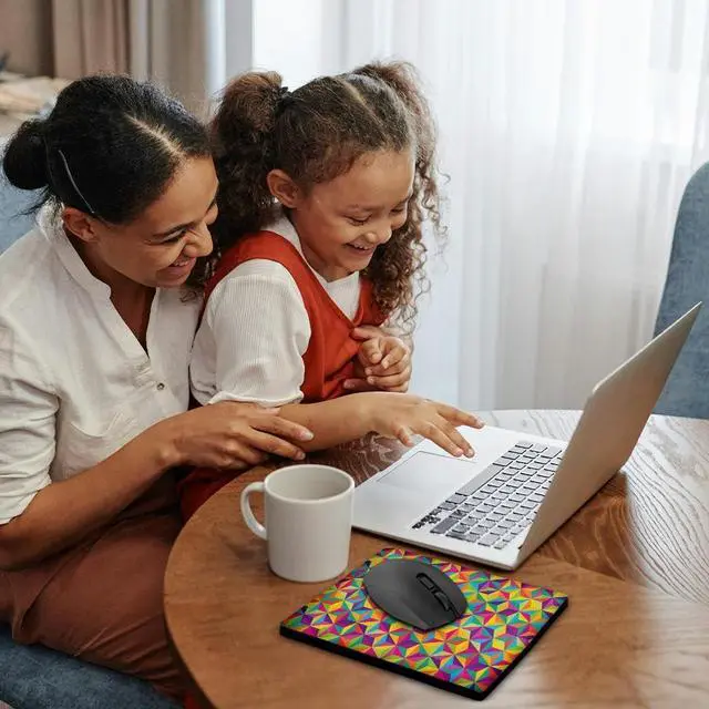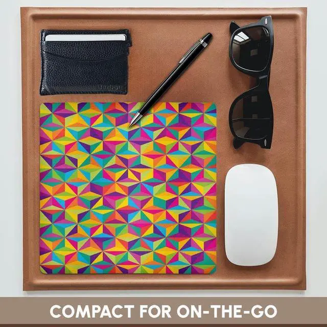 Geometric Illusions Cubes Rainbow Colors Abstract Funky Pattern Mouse Pad is 8" x 8" x. 25" and is made of heavy-duty recycled rubber. Matte finish image will not fade or peel. Machine washable using a mild detergent and air dry.