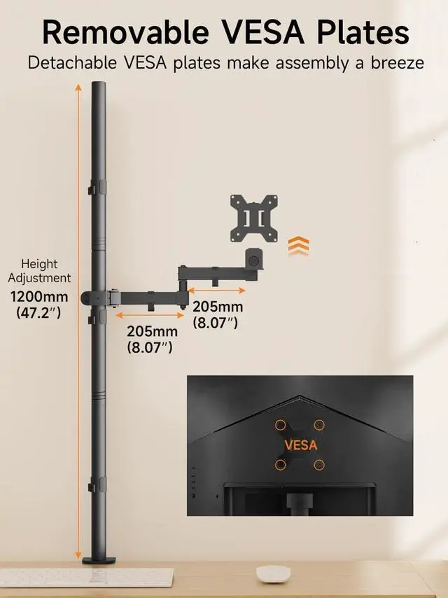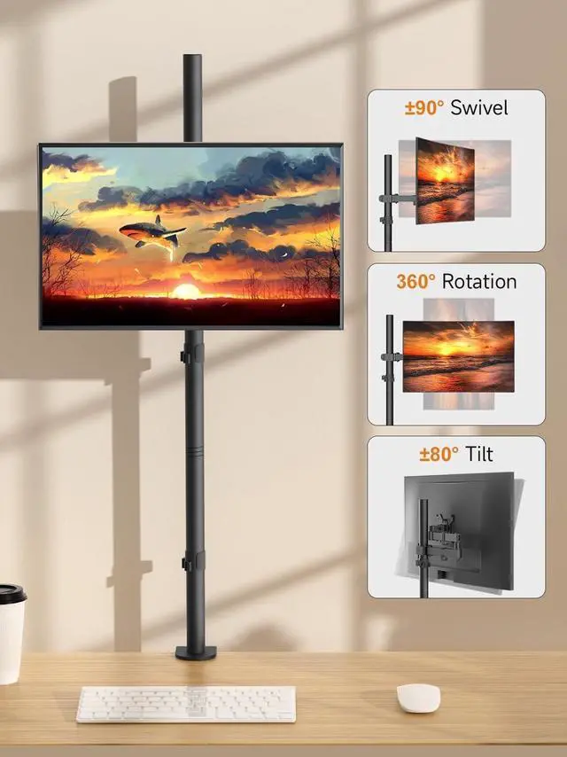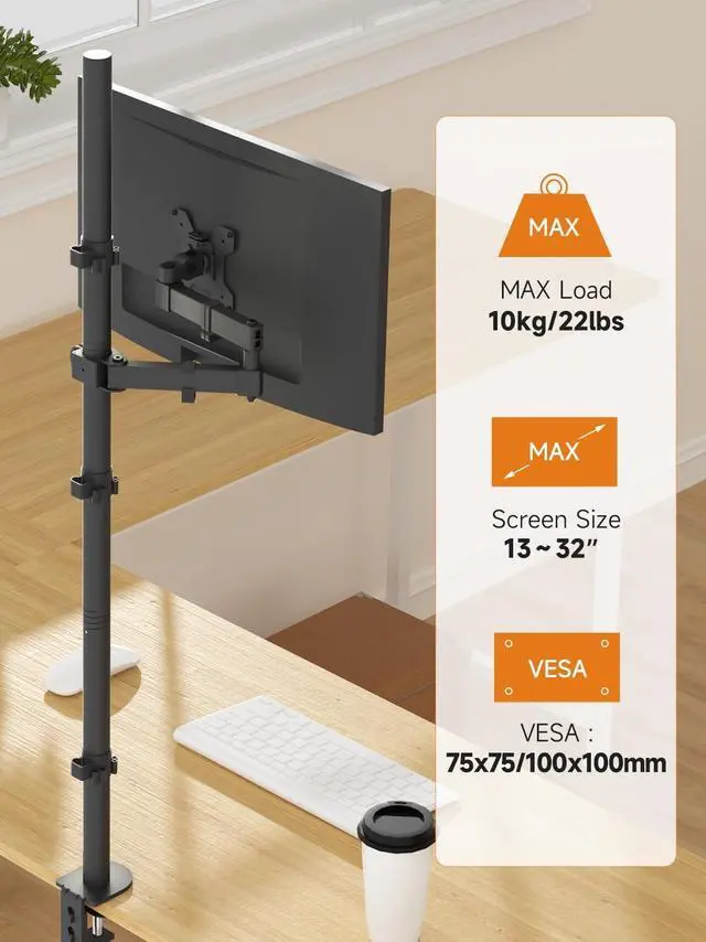 Strong steel arm mounts screen conveniently free up desk space. Hold one 13-32" monitor with a max load capacity 22lbs. ^^ Fits monitors with 75x75mm or 100x100mm VESA size (distance of 4 mounting holes on the back of the monitor). ^^ Feature +/-80 tilt, +/-90 swivel and 360 rotation, 1200mm height adjustable for optimum viewing angle.