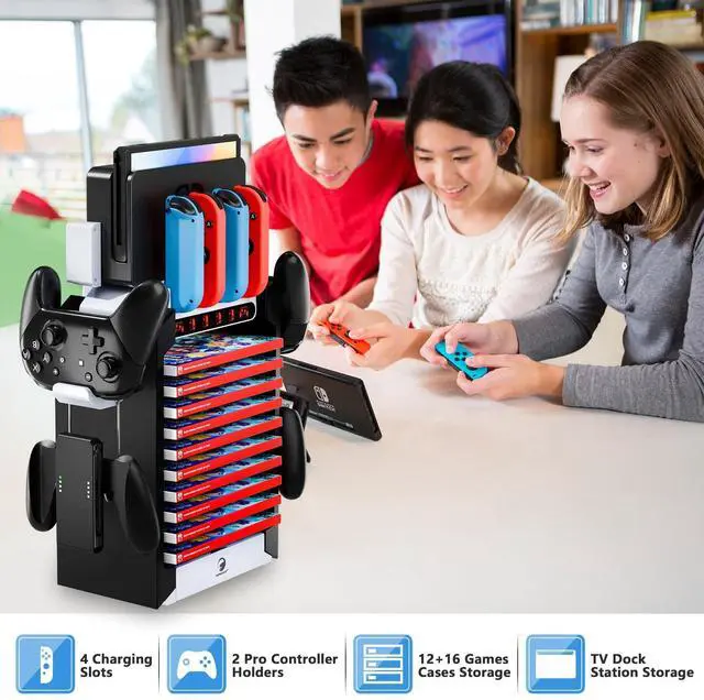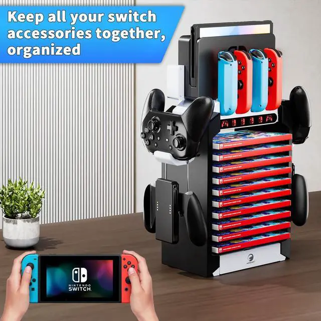 All-In-One Nintendo Switch OrganizerIn addition to charging 6 switch joycons controller simultaneously, HONCAM Switch storage tower is upgraded with powerful storage space, including 10 game card case, 2 Pro controllers, 2 JoyCon grip, 4 JoyCon strap storage and your favorite Switch OLED Dock. The drawer in the bottom offers you a good choice to collect your little stuff such as grips cover or game cards. Extra storage for tower make your game area clean and tidy, Save the space of your desk ^^ 2H Fast Switch Charging StationFeatured with rail charging slots, the switch charging dock storage charge 4 Joycons and 2 original contrlollers within 2 hrs.