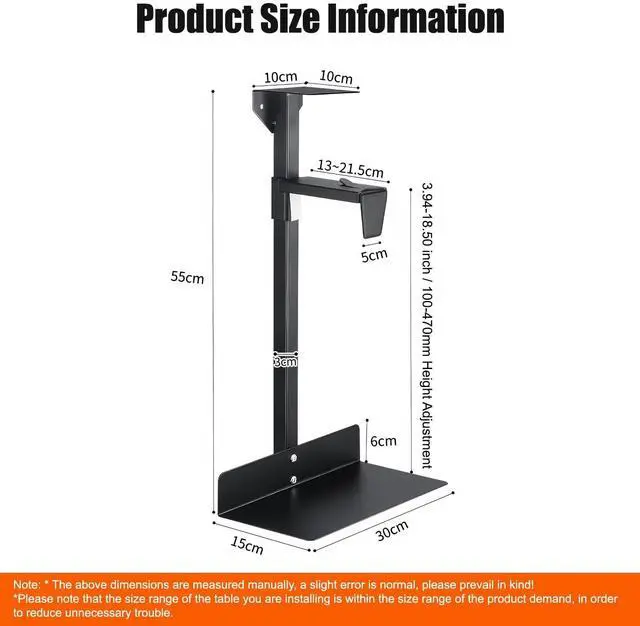 Transform your workspace with Fuerdich's heavy-duty under desk PC mount, engineered to support an impressive 66 lbs of computing power. This robust steel mount elevates your computer tower off the floor, featuring adjustable height settings from 100-480mm to accommodate various PC sizes. The dual-pillar design with anti-slip mats ensures rock-solid stability, while the adjustable arm extensions (130-230mm) provide flexible positioning options. By lifting your PC off the ground, this mount not only saves valuable space but also promotes better airflow and reduces dust accumulation. The sleek black finish complements any office setup, and the thoughtful design maximizes legroom while keeping your computer secure.