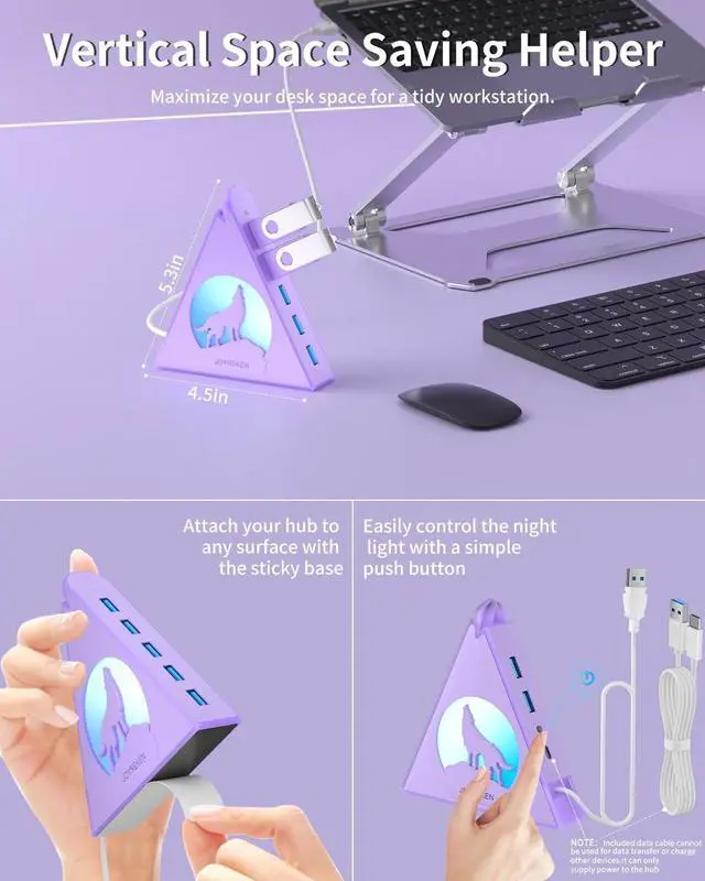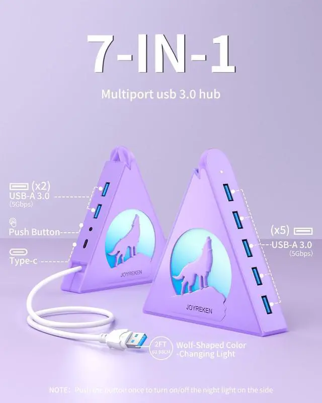 external hard drives (note: not for charging). With data transfer speeds of up to 5Gbps, its over 10 times faster than USB 2.0, making file transfers and backups quick and efficient. Featuring vibrant RGB lighting and a unique triangular design, this hub adds a stylish touch to your workspace. The wolf-head LED cycles through seven colors, while double-sided adhesive tape ensures secure mounting to your desk. The 2FT extension cable provides flexible placement options, and the included cable tie helps keep everything organized. Compatible with Windows, Mac OS, and Linux, it works seamlessly with laptops, desktops, Xbox, PS4/PS5, flash drives, printers, and more. Ideal for expanding connectivity and keeping your workspace tidy.