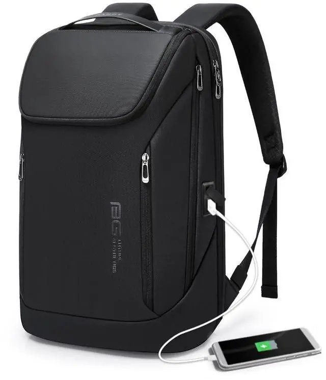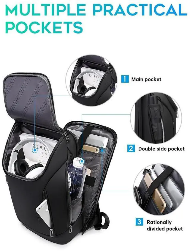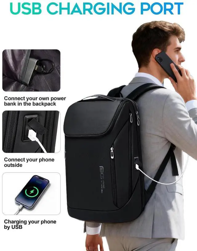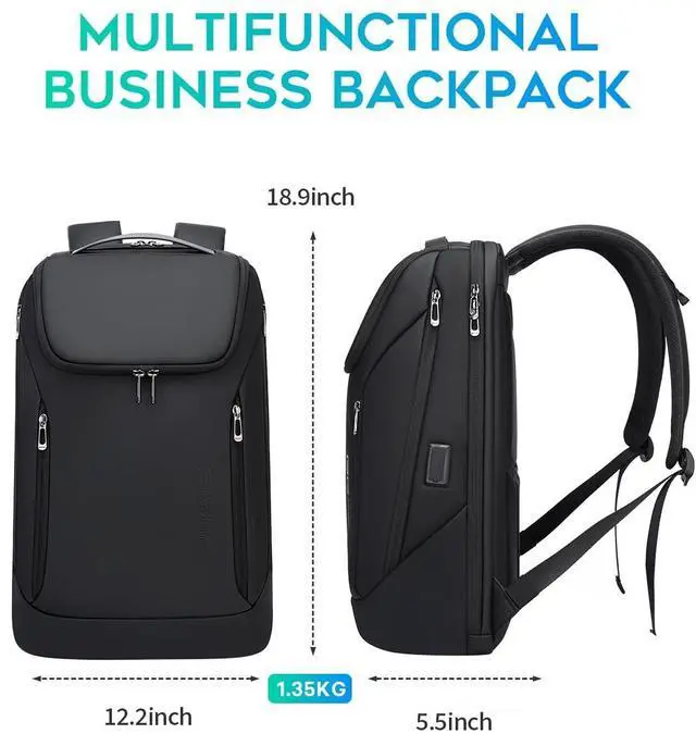 DescriptionThe laptop backpack is USB version revision be a more minimalist design, so the backpack no USB charge port and reduce a function such no two side small pocket and the shoulder strap no ID card pocket, glasses hang bucks, so choose suitable yourself ones the commute backpack can hold 15.6 inch laptop, The front pocket can be use fit casual shoes, sky, 9.7 ipad, Magazine and Other small thing, the main pocket can contain 4-5 clothingand the the laptop pocket compartment can hold 15.6 inch laptop. the side have a pocket can store kettle, umbrella.