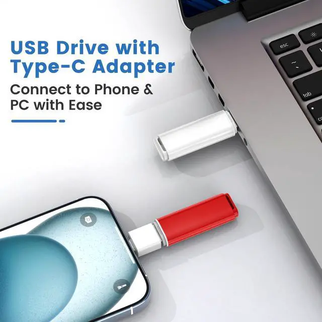 Vibrant 5-Color Set This USB flash drive set includes five eye-catching colors. Easily sort your files by color for different usesperfect for work, school, or personal storage ^^ Type-C Adapter IncludedEach drive comes with a Type-C adapter, making it compatible with Type-C devices such as iPhone 15/16, Android smartphones, tablets, and PCsswitch seamlessly between devices ^^ Reliable Performance with USB 3.0E quipped with high-quality chips to ensure stable storage and data transfer. Plug and playno software installation required ^^ Wide CompatibilitySupports Windows 11/10/8/7/Vista/XP/2000/98/ME/NT, Linux, Mac OS, and Chrome OS.