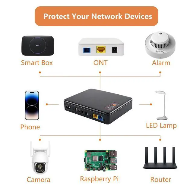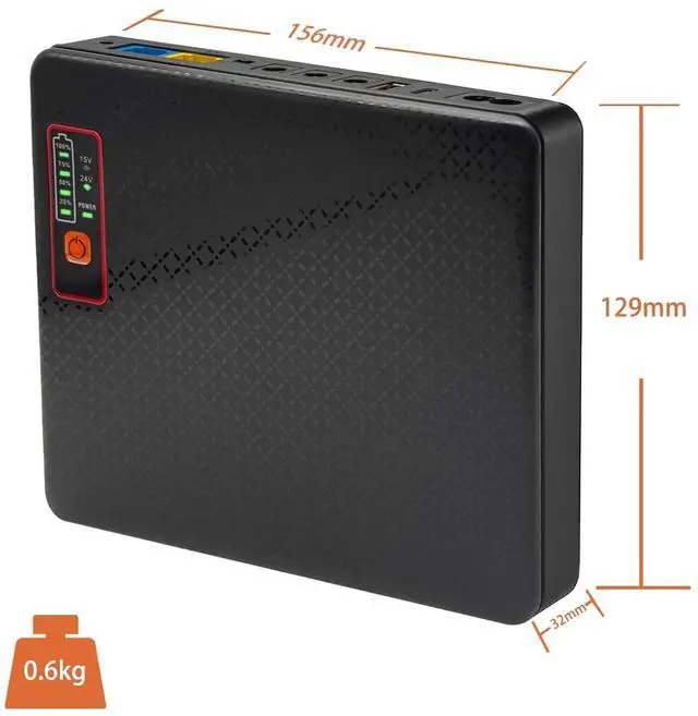 Total 18W max output with automatic power-off protection for overload safety ^^ 5V2A, 9V1A, 12V 1.5A DC outputs and PoE ports power security cameras, while USB-A and USB-C ports charge phones ^^ 16000mAh (59Wh) lithium battery backup for your router modems during power outages ^^ Mini UPS, compact size, weight 1.3 lb ^^ LED indicator display shows remaining battery level ^^ Stable voltage and protects against overcharge, overdischarge, and short circuits ^^ Comes with plenty of DC barrel adapters and a US charger