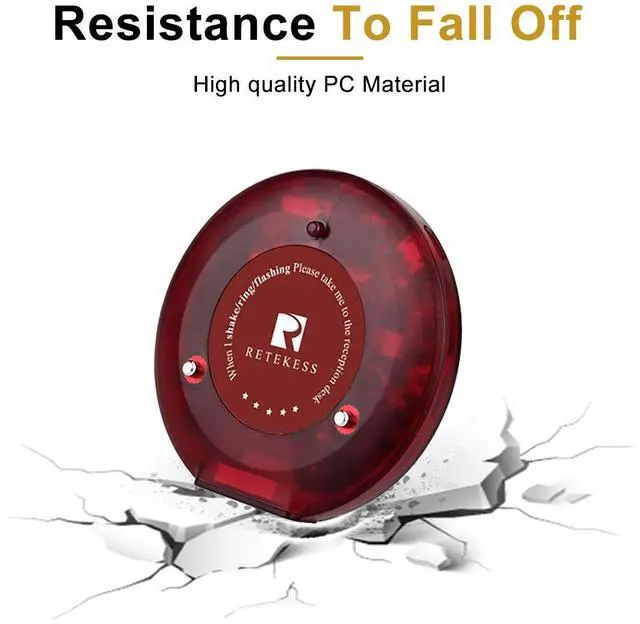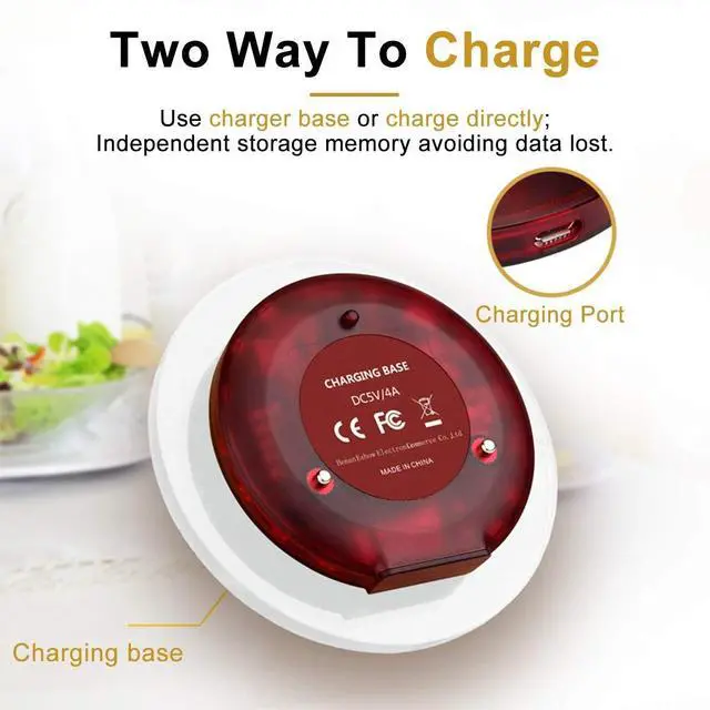 Retekess T119 restaurant pager system can add up to 999 pagers; you can always add more buzzers to the call system as your business grows ^^ Built-in 400mAh lithium battery; 72 hours standby; 36 hours in use; avoids the issue of frequent charging ^^ 2 charging methods; 1 charger base can charge up to 10 coaster pagers at the same time; each pager has a charging interface to charge separately; charging is more convenient ^^ 3 reminder modes; buzzer and flash; vibration and flash; buzzer vibration and flash; different reminders can be selected to suit the needs of restaurant; hospital; church nursery; food court; coffee shop; etc ^^ There is a power button on the bottom of the coaster pager; when the customer receives the call but doesn't want to be disturbed by the reminder sound; he can turn off the reminder sound
