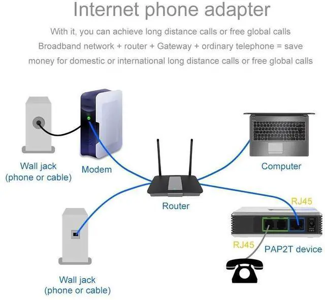 Internet Phone AdapterInternet phone adapter With the Analog Telephone Adapter, you can easily achieve long distance calls or global calls along with broadband network, router, orinary telephone. (Broadband network + router + Gateway + ordinary telephone = save domestic or international long distance calls or global calls). ^^ 2 PortsBrand new small gray box packaging. Phone Adapter with 2 Ports for Voice over IP. The power port is connected to the power source. ^^ SIP V2 ProtocolVoIP Gateway supports SIP V2 protocol. Compatible with all common phone functions: caller ID, call waiting, voice mail, etc. Support most Internet phone providers, such as Vbuzzer, Voipdiscount, Voipbuster, etc. Support domestic SIP protocol platform. ^^ Come With Network CableVoIP Gateway comes with a network cable.