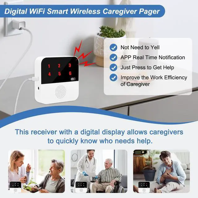 Better Care for the ElderlyThe call system can be connected to your cell phone for remote push. Easy to use, when the elderly fall or need help, just press the emergency button, the receiver sounds an alarm and at the same time, you will receive the alarm reminder immediately through the APP of your smartphone. ^^ Distance will not be a problemThis pager has added new features compared to traditional pagers, the receiver can send the wireless signal to the cell phone by connecting to Wifi, no matter the cell phone is in other cities or provinces, you can receive instant alert reminders at any time, anywhere, and the smartphone will show the information record.