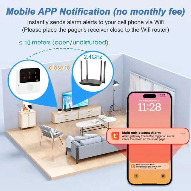Better Care for the ElderlyThe call system can be connected to your cell phone for remote push. Easy to use, when the elderly fall or need help, just press the emergency button, the receiver sounds an alarm and at the same time, you will receive the alarm reminder immediately through the APP of your smartphone. ^^ Distance will not be a problemThis pager has added new features compared to traditional pagers, the receiver can send the wireless signal to the cell phone by connecting to Wifi, no matter the cell phone is in other cities or provinces, you can receive instant alert reminders at any time, anywhere, and the smartphone will show the information record.