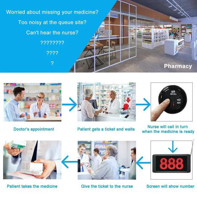 A: You only need to give the customer a queue number (take a number from ticket dispenser), when it is the turn, press the NEXT key on the calling button, the screen receiver will display and broadcast, then the customer will go to the service place.