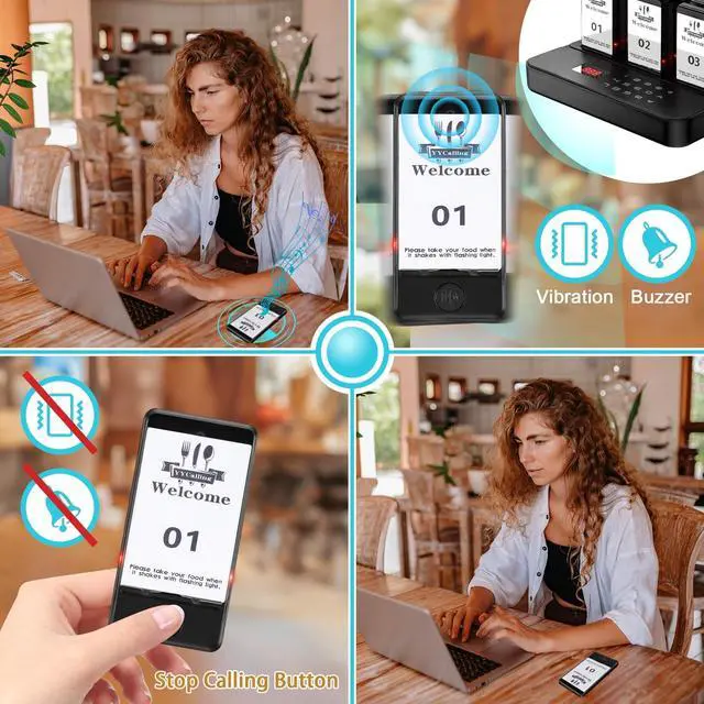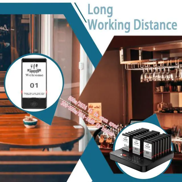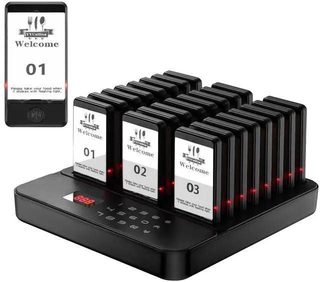 YYCALLING Wireless Calling SystemBased on 315MHZ radio-frequency, the indoor transmission distance is 984-1640 feet, and the open area can transmit up to 3280 feet/1000 meters, which can effectively reduce close contact and provide better safety protection measures for your employees, customers and patients. ^^ 7 Calling Modes7 modes for restaurant paging system are vibration+flash+buzzer, vibration+flash, flash+buzzer, vibration+buzzer, vibration only, buzzer only and flash only, meeting different occasions. Widely used in restaurants, hotels, hospitals, and cafes. ^^ Rechargeable Battery24 charging slots provide power whenever you put the pager on the base, so you don't have to worry about running out of power.