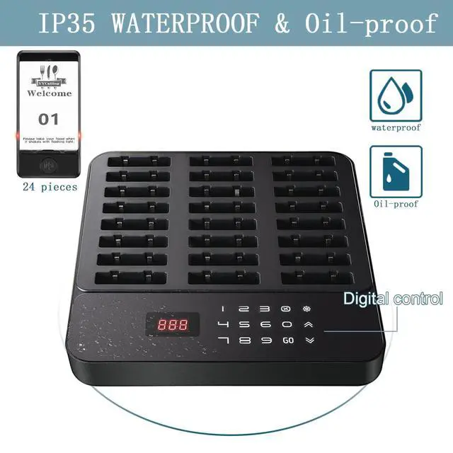 With 16pcs pagers. 24 hours of continuous use when fully charged (IP55 waterproof). ^^ Convenient and Efficient Save space effectively; this pager system puts visitors at easy and no need to look for parents in the congregation; when their children need help ^^ Durable And Easy CleanMatte surface resists oil and daily grime, easily wiped clean, designed for fast-paced food service conditions