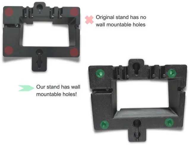 Compatible with Multiple Models Designed to fit SIP-T40P, T40G, T41P, T41S, T42G, T42S, T42U, T43U, T44U, and T44W IP phones. ^^ Direct Replacement for WMB-T4S Matches original dimensions for a secure and professional installation. ^^ Improved Design with Mounting Holes Includes built-in screw holes for easier wall installationno drilling required like with the OEM version. ^^ Durable and Reliable Constructed from strong ABS plastic for everyday use in office and commercial environments. ^^ Trusted by Refurbishers and Office Installers Ideal for replacing broken or missing stands in call centers, offices, or IT refurbishing environments.
