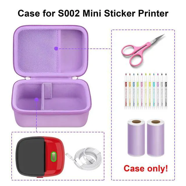 (Note: for sale is case only, S002 study label printer and other accessories are not included) ^^ Exquisite DesignThis S002 sticker printer case features sturdy double zips which can be opened closed freely and smoothly in multiple directions. The S002 thermal printer case comes in a deep spacious mesh pocket so you can have more space to accommodate self-adhesive thermal paper and small printer accessories, keeps them tidy and clean in the S002 sticker maker carrying case and easy reach. Adjustable Velcro strap in S002 thermal sticker printer case that you can flexibly place the printer. ^^ Superior MaterialThis S002 label maker protective case is made of high- density fabric and hard EVA material which is anti-squeeze, anti-collision, splash-proof, dust-proof, anti-stain and semi-waterproof, protect S002 sticker maker from damages caused by indoor or outdoor activities, which can prevent bumps and scratches, and extend the life of your cute S002 study printer. Soft velvet interior lining keeps S002 pocket mobile sticker printer safe in the hard S002 sticker maker case. ^^ Travel-FriendlyThis S002 sticker maker case comes with a soft silicone handle, kids can easily carry ORGSTA S002 mini sticker printer case to go anywhere, or hang the label maker storage case up when not use.