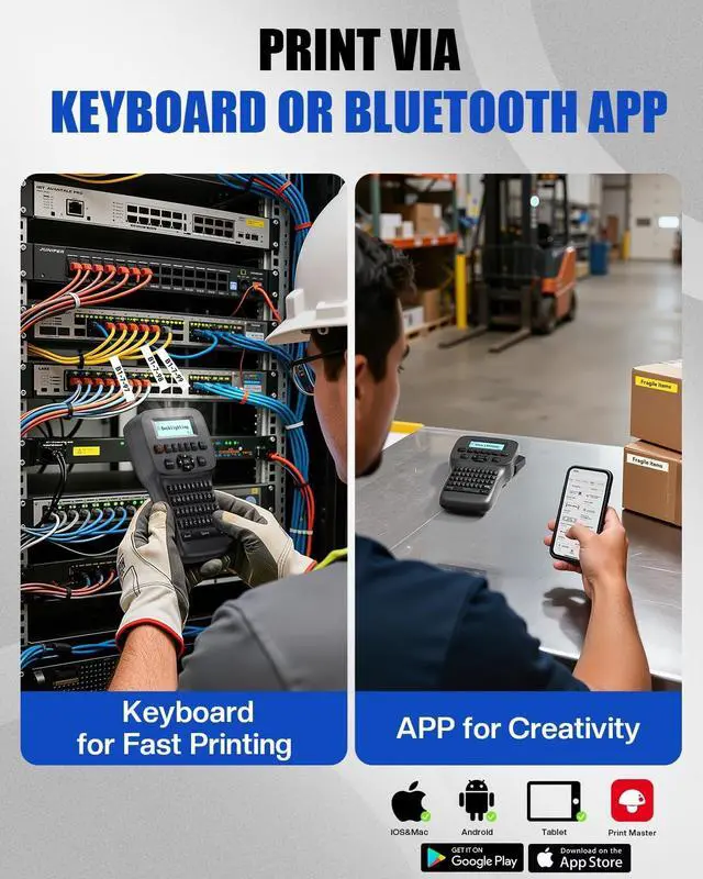 INDUSTRIAL-GRADE DUAL OPERATION MODES: Experience ultimate flexibility with the EazeID LM1600, a versatile handheld label maker that offers two professional modes. As a powerful label maker with keyboard, it features a traditional QWERTY layout for swift, on-the-spot label creation. Alternatively, as a Bluetooth label maker, it connects seamlessly to your smartphone for advanced design. This dual-mode labeling machine is perfect as an industrial label makeror a versatile office label maker, ensuring you have the right tool for any task, from complex cable label maker projects to simple home organization ^^