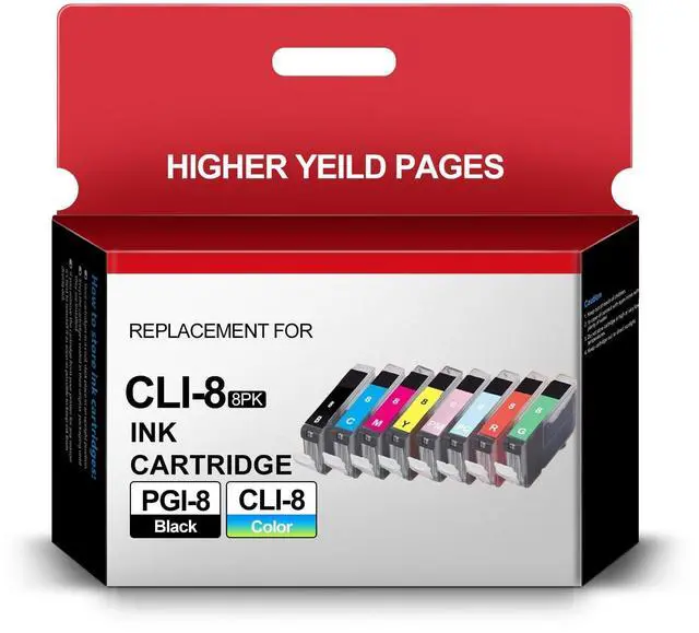 • PACKAGE :8 Pack for CANON CLI-8 Ink Cartridge (1 Black, 1 Cyan, 1 Magenta, 1 Yellow, 1 Photo Cyan, 1 Photo Magenta, 1 Red, 1 Green).