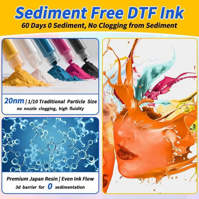 Advanced Sediment-Free TechnologyOur DTF transfer ink For Epson ET-8550 utilizes cutting-edge suspension stabilization technology, which can remain free of sediment for 60 days. This innovation significantly reduces nozzle clogging, making it the perfect choice for high-quality printing ^^ Long Lasting Vibrancy Engineered with premium German solvents and Japanese resins/pigments, our DTF ink for epson et-8550 delivers professional grade color reproduction with exceptionally vivid hues and crisp. The transferred designs boast superior durability - wash after wash, they maintain their brilliant colors without fading or cracking, giving you truly worry-free performance that stands the test of time ^^ Diverse Application EnvironmentsThe no sediment DTF ink for Epson 8550 works with PET thermal transfer films, with particle sizes of 20nm, 1/10 Traditional Particle size, offering stable membrane performance, reliable adhesion, its soft, elastic texture stretches without cracking.
