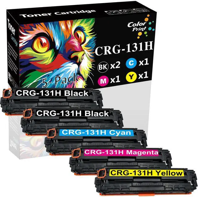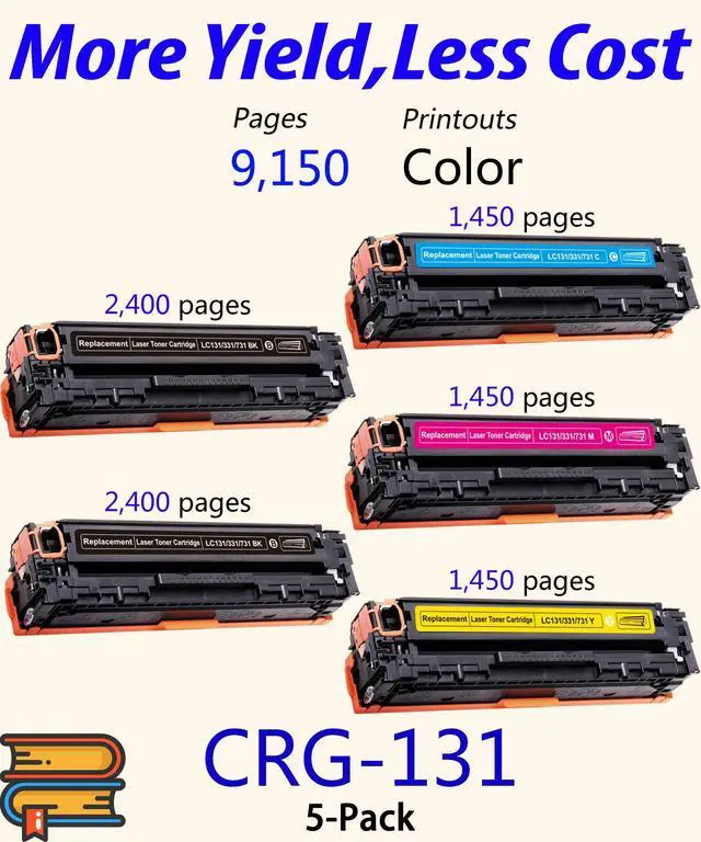 Page Yield: 2,400 pages for Canon 131H black toner cartridge; 1,800 pages for Canon 131H per color toner cartridge at 5% coverage