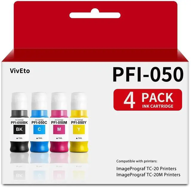 Contents: VivEto ink replacement for Canon PFI-050 PFI050 ink tank; 4-Pack color PFI 050 ink cartridge (PFI-050BK Black, PFI-050C Cyan, PFI-050M Magenta, PFI-050Y Yellow) ^^