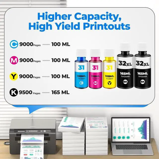 Inks Page Yield: These smart tank inks are high capacity 31 32xl inks and can print more printouts. At 5% coverage on A4 paper, 9500 pages for 32xl black ink bottle, 9000 pages for cyan 31 ink bottle, 9000 pages for yellow ink 31 bottle, and 9000 pages for magenta 31 ink bottle. For smart tank 5101 ink bottles, smart tank 7602 ink bottles, smart tank 5000 ink bottles, smart tank 651 ink bottles, smart tank 7001 ink bottles, smart tank 7301 ink, smart tank 5103 ink, smart tank 6001 ink ^^