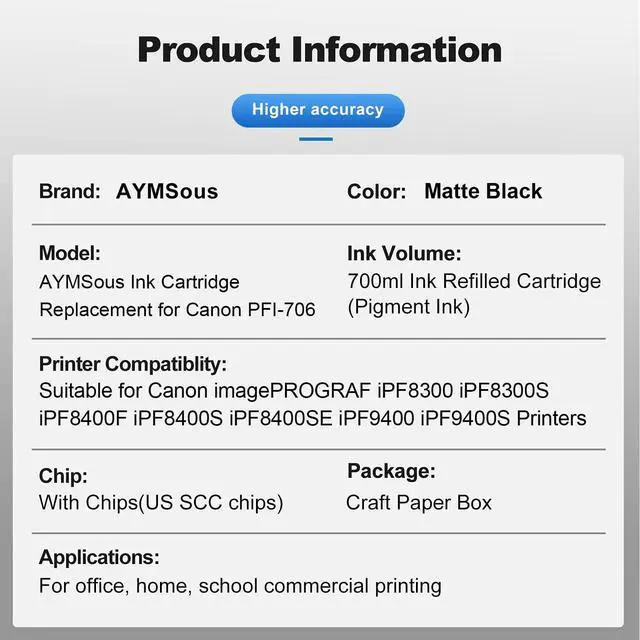 Package Contents: 1 Pack Matte Black 700ML PFI-706 Pigment ink cartridge with SCC chip ^^