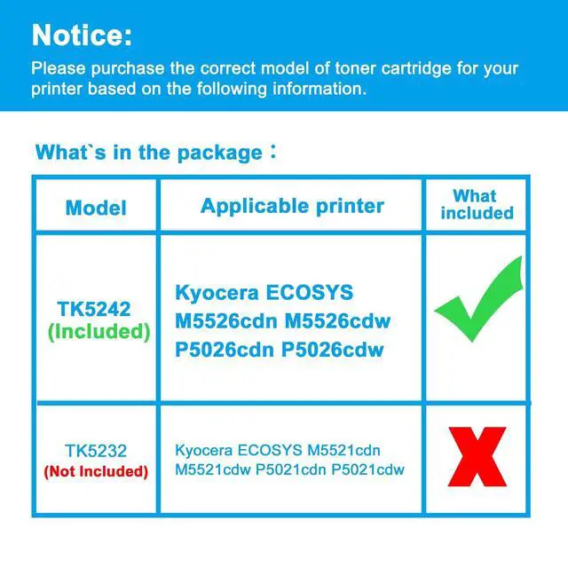 Reliable Quality: LCL TK5242 cartridge uses high quality toner, toner particle size distribution, good mobility, high transfer rate, resulting in a clear image and high gloss print effect; Printing efficiency is high, waste powder rate is low, so as to ensure sufficient page yield.