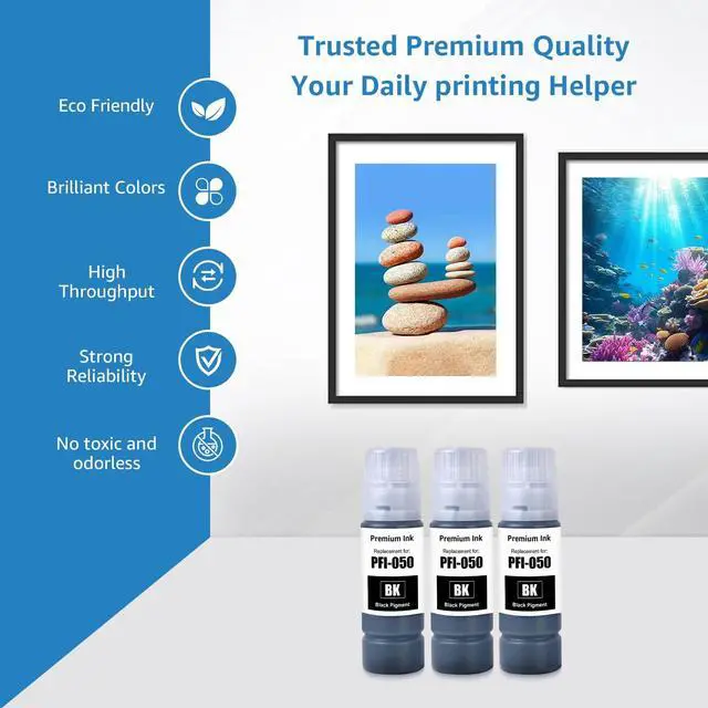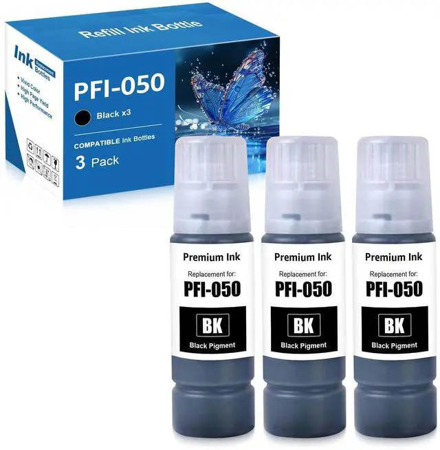 Package List3 Pack PFI-050BK Ink bottle Multipack (3x PFI050 Black). ^^ PFI-050 Black Pigment Ink High CompatibilityCompatible for Canon imagePROGRAF TC-20 TC-21 TC-20M TC-21M Printer. ^^ High Page Yield with Extra Ink Volume70ml per PFI-050 PFI050 Black Ink Tank. ^^ Rigorous Testing and High qualityEach Yongairuink compatible PFI-050BK 5698C001 Pigment ink bottle undergoes a rigorous quality testing process to ensure fade-resistant and vibrant colours help you to efficiently capture the important moments at work, study and in life. ^^ Reliable Printing PartnerYongairuink PFI-050 BK Ink Tank is designed to deliver outstanding, brilliant and true-to-life images and clear documents to meet your different printing needs.