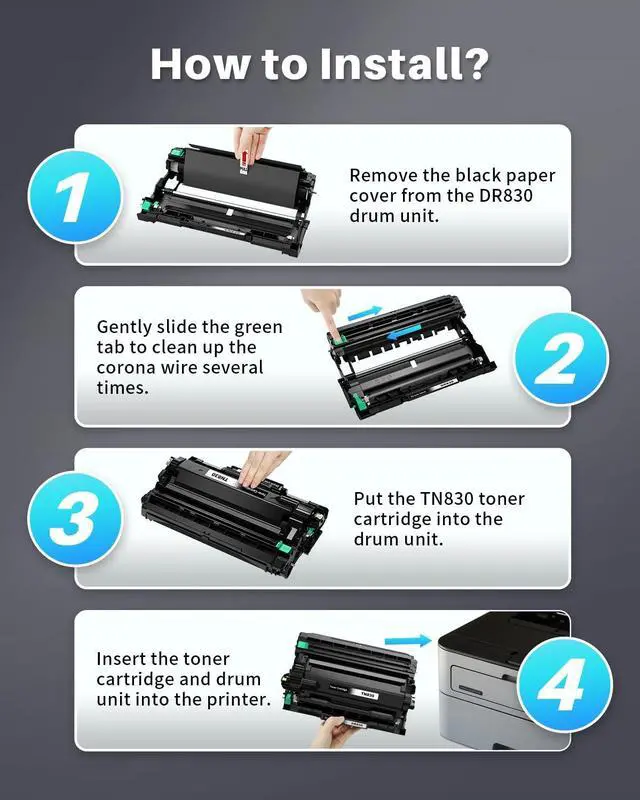 Product Item INK4U Compatible Toner Cartridges Replacement for Brother DR830 Drum Unit, No toner ^^ Printer Compatibility Compatible with HL-L2400D, HL-L2405W, HL-L2420DW, HL-L2460DW, HL-L2460DW XL, HL-L2465DW, HL-L2467DW, HL-L2480DW, HL-L2865DW, DCP-L2640DW, DCP-L2647DW, MFC-L2760DW, MFC-L2807DW, MFC-L2820DW, MFC-L2820DWXL, MFC-L2900DW, MFC-L2900DW XL, MFC-L2980DW Printer ^^ Package Content 1 x DR-830 Drum Unit, 1 x Instruction Guide ^^ Page Yield Up to 15, 000 pages per dr830 drum unit (at 5% coverage of A4 paper) ^^ Our Advantage The INK4U brand DR830 drum unit is engineered to work with printers to provide consistent quality, reliability and value.