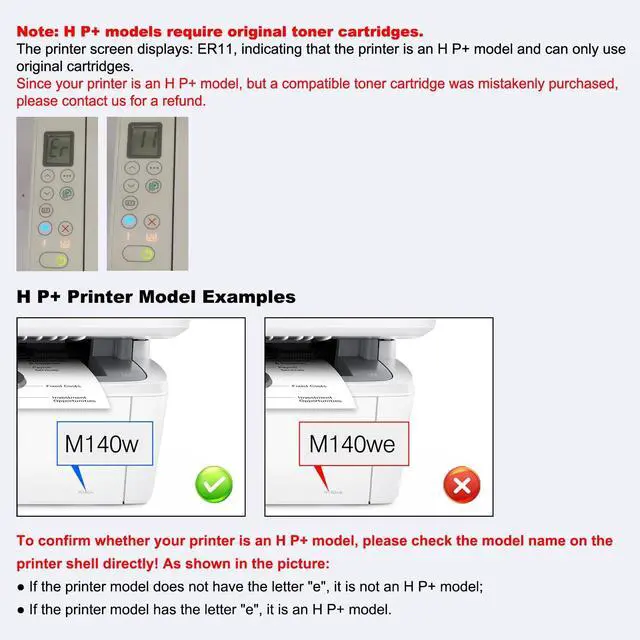 Important Notice: Our toner cartridge can not work with H P+ printers that have model numbers ending with "e". H P+ printer only works with original toner cartridge, can not work with compatible toner cartridge. ^^