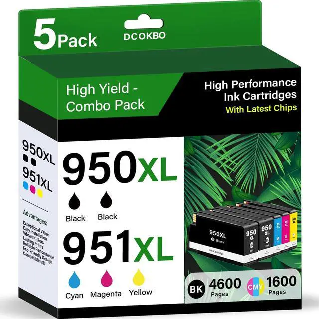 COMPLETE 5 PACK 950 XL 951 XL COMBO Includes 2 x 950XL Black, 1 x 951XL Cyan, 1 x 951XL Magenta, and 1 x 951XL Yellow compatible ink cartridges. Each cartridge is equipped with the latest smart chip to ensure seamless recognition and accurate ink level tracking with your printer.