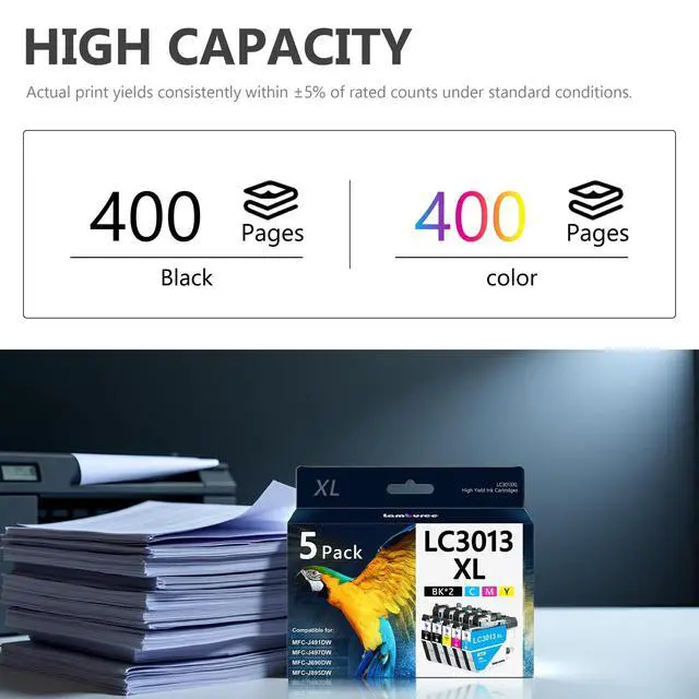 LC3013XL: 400 Pages for LC3013XL black ink cartridge, 400 Pages for LC3013XL color ink cartridge ^^ The LC3013 XL ink cartridge is rigorously tested to deliver professional-grade, dark, crisp prints with zero streaks, leaks, or smudgingensuring flawless performance every time ^^