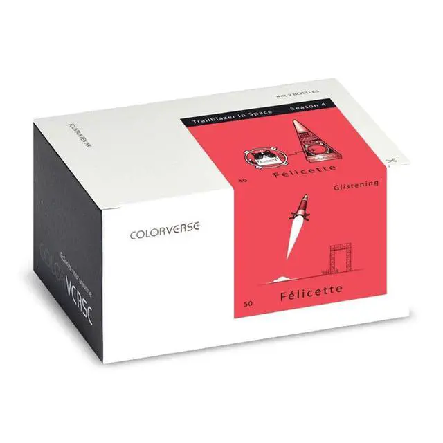 Includes 2 bottles of Colorverse Fountain Pen Ink, No. 49 Felicette and No. 50 Felicette - Glistening ^^ Dye Based Fountain Pen Ink ^^ Felicette - RGB 246 80 88; Web #F65058; Pantone Red 032 U ^^ Colorverse Fountain Pen Ink - Trailblazer in