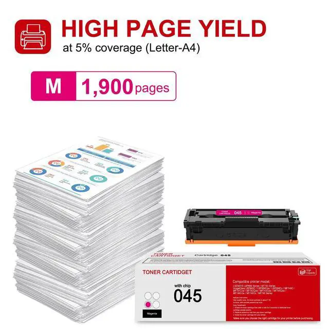 ^^ Page Yield: 1, 900 pages per CRG-045 M Magenta toner cartridge at 5% coverage. ^^ Highly purified toner assures the long-lasting character of the cartridge which allows it to produce more pages comparing to similar products. ^^ Please make sure your printer series before buying. If you have any issues please find us immediately., we always being with you and provide satisfied answers.