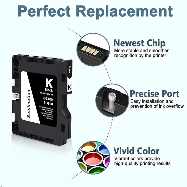 Superior Quality: The SG400 SG800 cartridges use the new upgraded chip technology to achieve 100% printer matching and easier installation and operation. And superior ink quality, providing better printouts, comparable to the original ^^
