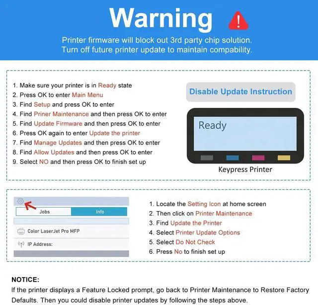 WARNING: Firmware will block out 3rd party chip solutions, Please Turn off future printer updates to maintain compatibility.