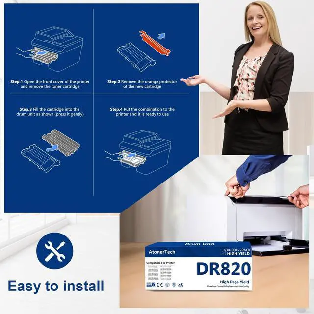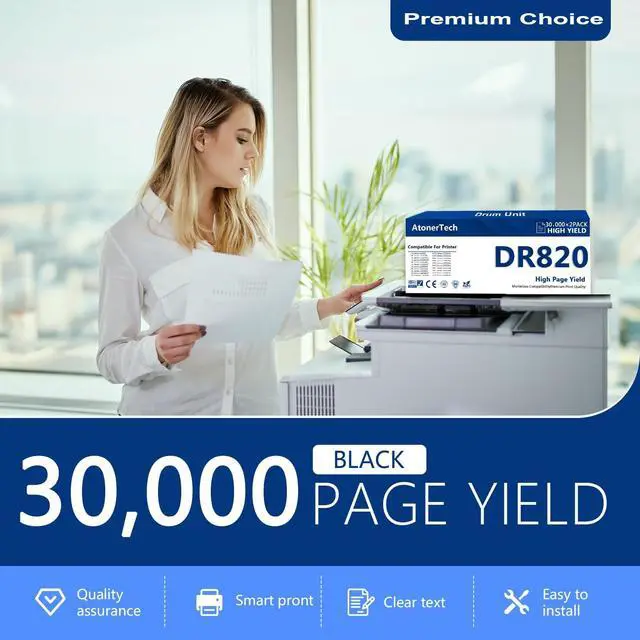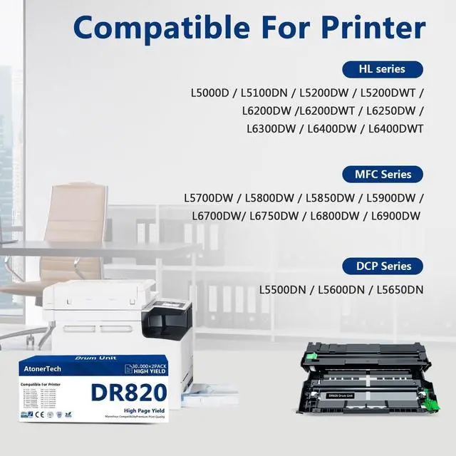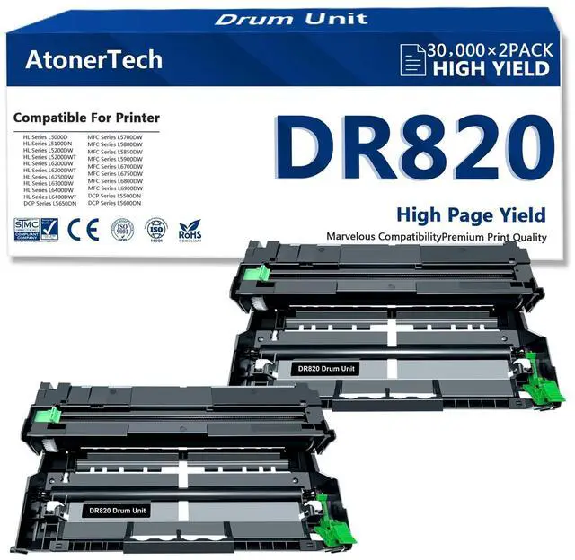 [PRINTER COMPATIBILITY] AtonerTech DR820/DR-820 Drum Units, this 2-pack replacement for HL-L5000D L5500DN L5600DN L5650DN HL-L5100DN HL-L5200DW HL-L5200DWT HL-L6200DW HL-L6200DWT HL-L6250DW HL-L6300DW HL-L6400DW HL-L6400DWT L6750DW L6900DW L5700DW L5850DW L5800DW L5900DW L6700DW L6800DW Laser Printer ^^ [HIGH-YIELD PERFORMANCE 30, 000 PAGES] Maximize productivity with 2 premium black drum units offering up to 30, 000 pages total yield. Ideal for high-volume printing. ^^ [PRO-GRADE PRINT QUALITY] Engineered with precision-toned components for flawless text/grayscale output. Works in tandem with TN-820/TN-850 toner cartridges to eliminate streaks, smudges, or fading. Achieve laser-sharp documents every time.