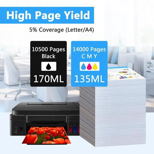 Package Content: Total 5 ink bottles (2 Black+1 Cyan+1 Magenta+1 Yellow); The capacity is 170ML per black ink bottle and 135ML per color ink bottle. 10500 pages per black ink bottle and 14000 Pages per color ink bottle at 5% Coverage (Letter /A4).