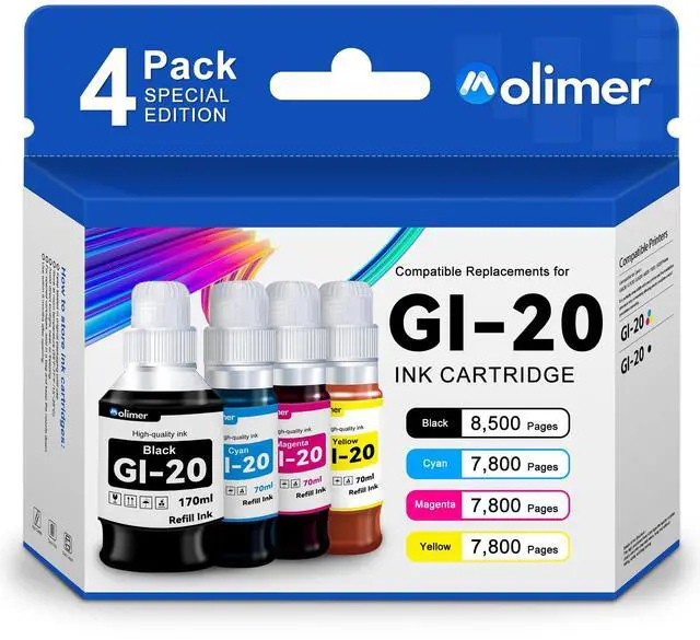 Feature: GI-20 GI20 ink bottles designed for smooth, high-yield printing. Bright colors and clear lines are printed. High quality and excellent results for daily printing in the office and home. Meet your daily needs anytime, anywhere ^^ Our GI-20 GI20 Ink Refill Bottle Kit products are packaged in shockproof packaging to ensure safe delivery