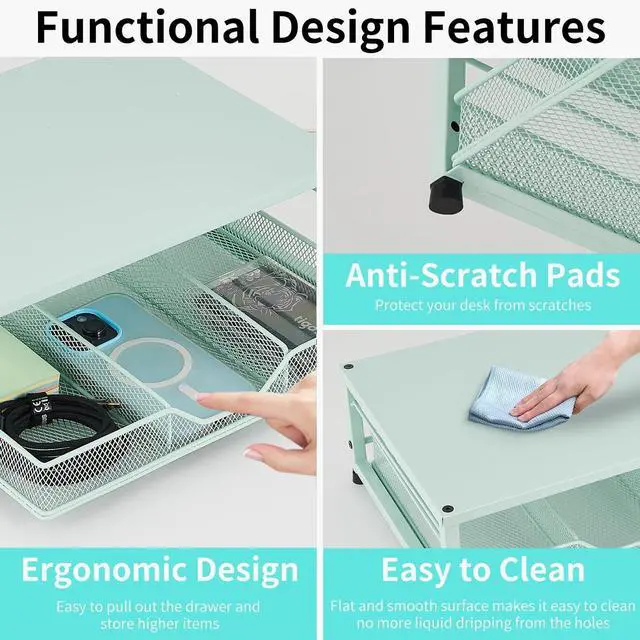 The foots attached to the bottom are adjustable for your best view height. Lets get healthier and more productive ^^ Widely ApplicationThis stand riser is not just for monitor, projector, printer and office supplies, you can also use it for your coffee nook as well, coffee beans, sweeteners, filters, tea bags and other accessories can be placed separatedly in the 3-slot drawer. You can also use it for cosmetics and perfume organization, toys display, pet bowls holder and many other ^^ Worry-Free ShoppingIf there are any questions about the product, please feel free to contact us, we are always at your disposal