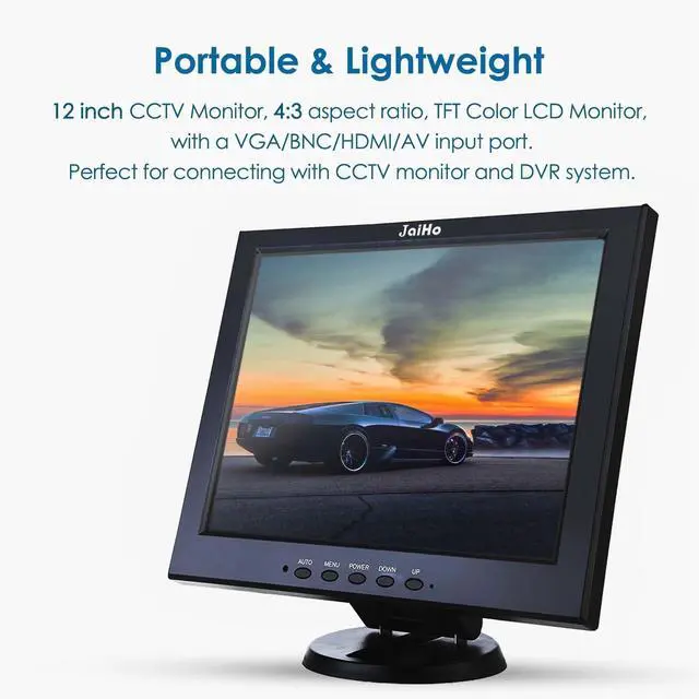Angle: 165 Degrees, LCD backlight source for long time continuous working and the requirement of 24/7 operation for surveillance application. ^^ Multi Video Interfaces12 inch small hdmi monitor provides a rich set of video input options with HDMI VGA BNC AV. Perfect for connecting with CCTV monitor and DVR system, Home/Office/Store Surveillance Camera STB, Also works for PC, rear view camera, DVD Box and MP5 etc. ^^ Slim Design12 inch LCD CCTV monitor with clear image and slim design. The housing made of ABS material with low temperature ductility and impact resistance. ^^ Built-in SpeakersJaiHo 12 inch monitor has built-in dual high-quality speakers, stereo sound for a better experience. Support VESA Mountable holes 75x75mm (included). Can be mounted on the wall or placed on a desk.