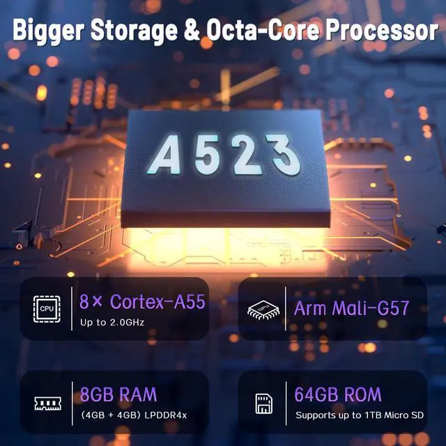 [Smooth Performance with Android 15 and Octa-Core Processor] This tablet runs the latest android 15 tablets operating system, powered by the Allwinner A523 Octa-Core Arm Cortex-A55 CPU (up to 2.0GH z), delivering responsive and efficient performance for work, entertainment, and learning ^^ [Stable Connection with Dual-Band WiFi 6 & Bluetooth 4.2 ] The android tablet supports 2.4G /5G dual-band WiFi 6 and Bluetooth 4.2 for faster, more stable wireless connectivity. Perfect for streaming, browsing, and video calls on your tablet 10 inch ^^ [8GB RAM, 64GB ROM, Expandable to 1TB + GMS Certified] This tablet comes with 8GB (4+4) RAM and 64GB storage, expandable up to 1TB via microSD card (not included).