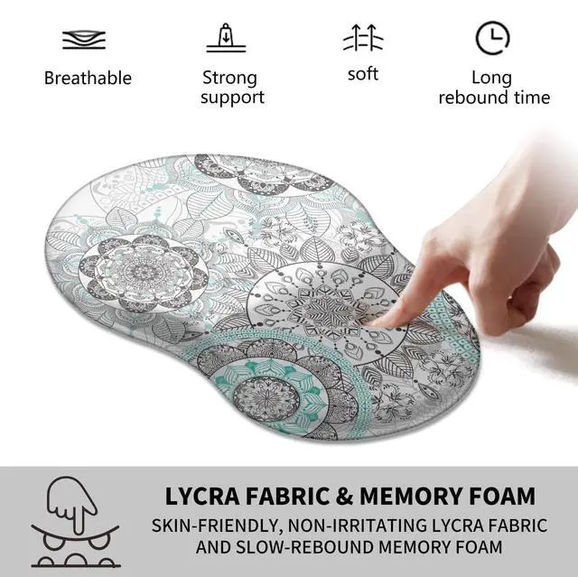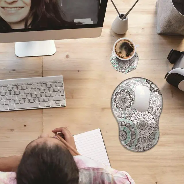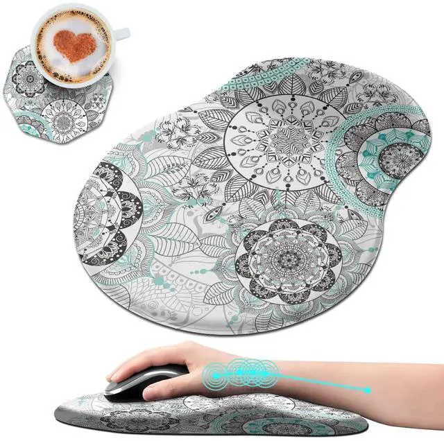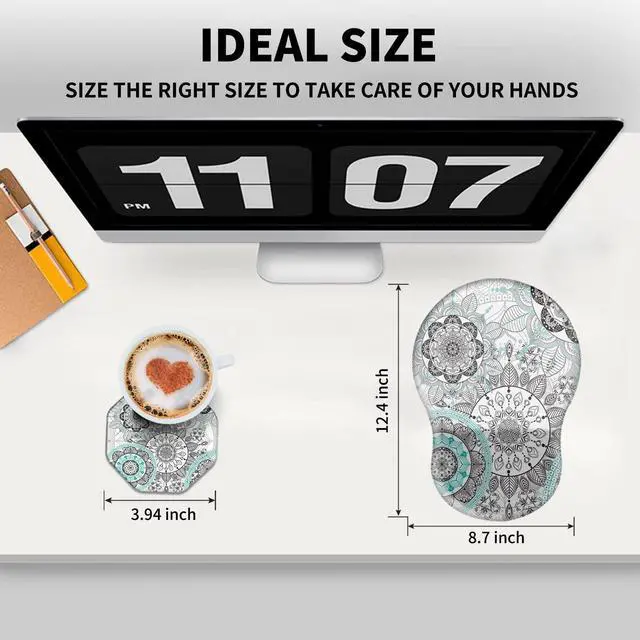Unique Shape and Size-- 13x 8.66 x 0.86 inches; Coffee Coaster 4" x 4" x 0.08" mouse wrist rest pad fits all types of mouse, wired, wireless, mechanical, laser & optical. The reinforced edges of mousepad prevent deformation and damage to guarantee long term use. High quality materials-- This mouse pad is made of memory foam with no additives or fillers. And the cover is made of soft and smooth fabric, no irritation to skin, is able to track the mouse movements fast and accurate. Not easy to curl up on the edges even after long time usage.
