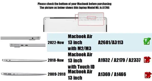 Only compatible with MacBook Air 13.6 -inch Model A2681/A3113 (2024 2023 2022 Released Version) with M2/M3 Chip. Please double check your laptop's model number "A1xxx" on the bottom of the laptop to determine the compatibility. ^^ NOT compatible with MacBook Air 13 Inch ( 13.3 ) A1932/M1 A2337/A2179(2018-2022 Ver. ) nor Macbook Air 13 inch( 13.3 ) Model A1369/A1466 Old Version 2010-2017. ^^ High Quality Hard Shell Case for original touch protect your MacBook, strong and durable material against shock, scratch, fingerprint, dusty and other damage, thin and light design will not increase excess volume.