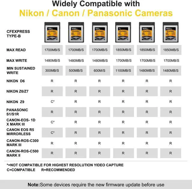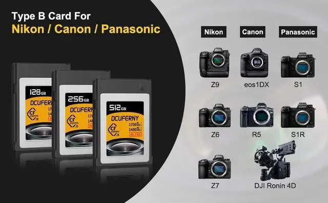 ^^ Supports PCIe 3.0 and NVMeDcuferny cfexpress type b memory card supports PCIe 3.0 and NVMe- -Utilizes PCIe 3.0 and NVMe protocol for unmatched speeds. In order to match the professional speed requirements, Dcuferny uses a professional adjusted memory controller, which is highly optimized and can be used for professional SLR cameras. Dcuferny cfexpress type b memory card series store products have undergone strict factory testing, canpatibility testing and life testing. ^^ XQD Card CompatibilityThe card is backwards-compatible with select XQD cameras that adopt firmware enabling CFexpress (2), the CFexpress Card Type B bridges existing devices with the future of technology.