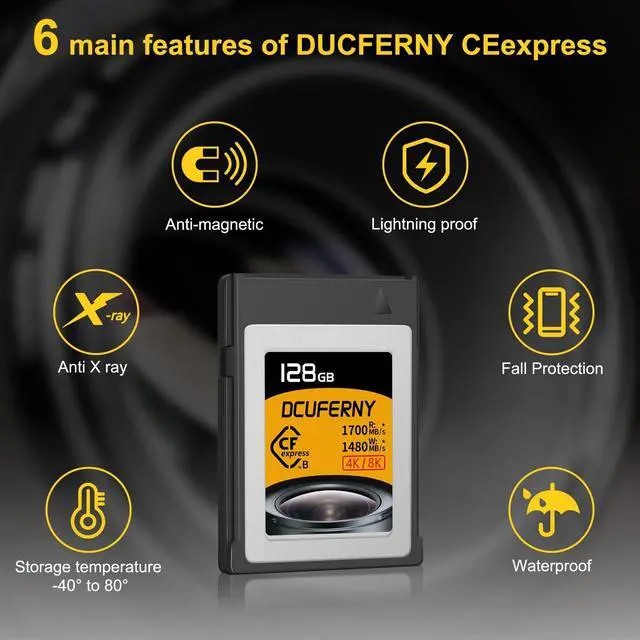 Read speeds of up to 1700MB/s and 1480MB/s write speeds for Express Transfer of Files & Large Storage Read speeds of up to 1700MB/s and 1480MB/s write speeds offer low latency during high-speed recording and enhance workflow efficiency far beyond existing CFexpress Type B Memory Cards. The marking speed of Dcuferny series products and packes is the maximum speed that can be achieved according to the internal laboratory test of our company. ^^ Smooth 4K/8K Video Performance Unleashes the RAW Performance of Your Gear. Enables smooth RAW 4K/8K video Recording to shoot Crisp, Clear, High-Resolution Images & Graphics.