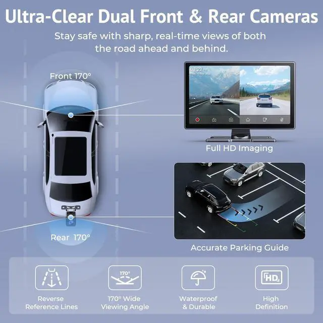This wireless CarPlay screen features a built-in HD microphone for crystal-clear voice capture, allowing you to make calls, play music, or get directions without taking your eyes off the road. ^^ Supports Rear Camera & Custom Boot Logo OptionsEnhance parking safety with a 1080P waterproof rear camera and a 6-meter extension cable included. This Car stereo CarPlay unit automatically switches to the rear camera when reversing. Customize the boot logo or screen to match your vehicle or show your personal style. ^^ Universal Power Compatibility for All Vehicle TypesPowered via Type-C 5V 2.5A using the included car charger, this portable CarPlay screen is compatible with 12-24V systems, making it suitable for cars, RVs, trucks, and SUVs of any brand or model. Ensure stable performance with the original charger to avoid FM interference. ^^ Preloaded 64GB TF Card & Important Usage TipsA 64GB TF card is pre-installed to store dashcam recordings, eliminating extra costs.