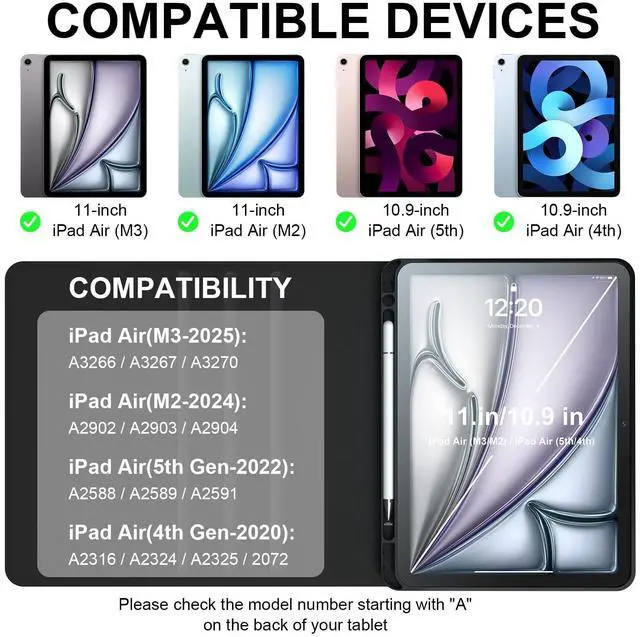 Wide Compatibility Perfectly fits iPad 4th Gen (2020, A2072/A2316/A2324/A2325), 5th Gen (2022, A2588/A2589/A2591), 6th Gen (M2/2024, A2902/A2903), and 7th Gen (M3/2025, A3266/A3267/A3270). Not for other devices. Please be kindly check the model number No. starting with the letter "A" of your tablet back before order ^^ Magnetic Detachable Bluetooth Keyboard Securely attaches to the case via strong magnets for stable typing, and easily detaches when not needed. Rechargeable via USB-C with long battery life. ^^ 3 Adjustable Viewing Angles The sturdy kickstand offers three fixed positions (typing, viewing, and drawing modes) for optimal comfort in any scenario.
