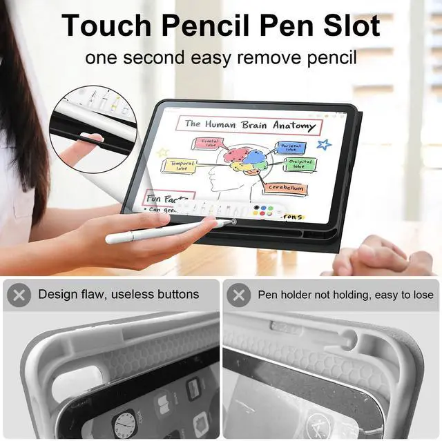 ^^ Premium Protective Design Durable PU leather exterior with soft microfiber interior shields your iPad from scratches, drops, and daily wear. Slim yet protective. ^^ Built-in Apple Pencil Holder Dedicated slot keeps your Apple Pencil securely in place. No more losing your stylus! ^^ Built-in Apple Pencil Holder Securely stores your stylus with a dedicated pencil slot, preventing loss and ensuring quick access for notes and creative work.
