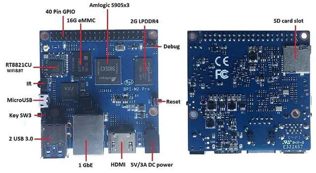 2021. It is powered by Amlogic S905X3 quad-core Cortex-A55 ( 2.0 GHz) processor. Onboard 2GB LPDDR4 memory and 16GB EMMC storage, and supports 2 USB 3.0 interface, a gigabit network port. RT8821CU wifi&BT onboard. 1 HDMI outputBPI-M2 Pro same size asBanana Pi BPI-M2+, and interface is also same. so can use BPI-M2+ case. -Hardware specification of Banana pi