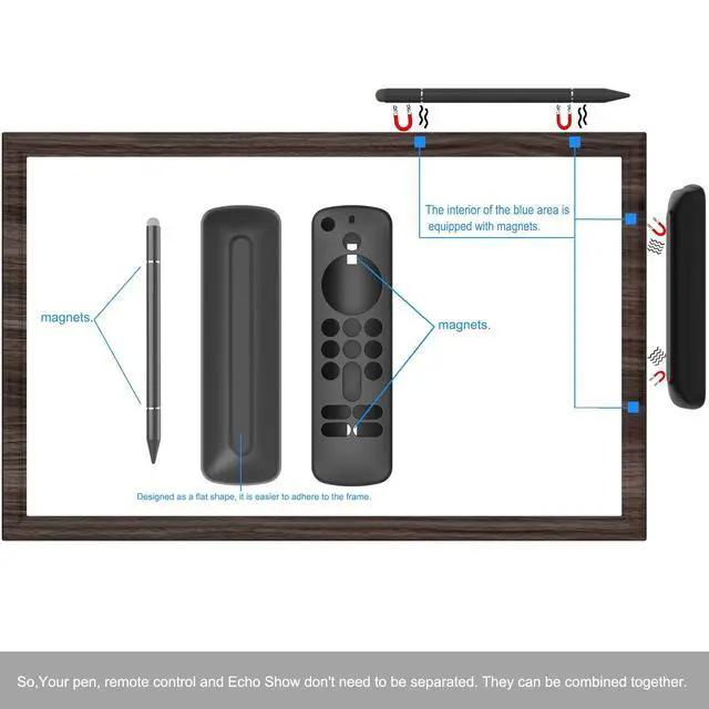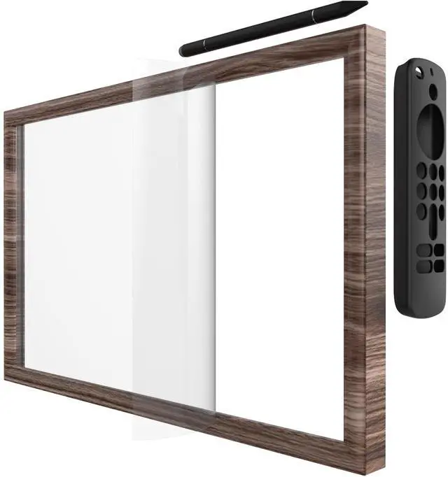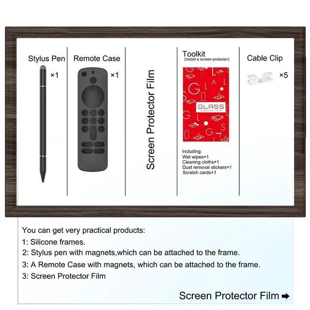 1. Suitable for the echo show 15 decorative frame, protective frame, made of silicone material, soft and delicate! The surface has undergone water transfer printing technology, The first decorative frame made of eco-friendly silicone material! ^^ 2There are three color options available: the light brown wood grain, which is close to cherry wood color. The dark brown wood grain, which is similar to black walnut wood color. And the white marble color. Choose the suitable color according to the decoration style. ^^ 3. Besides the frame, there is also a touch-sensitive stylus, a protective case for the remote control, and a high-definition screen protector. There is also a toolkit for installing the screen protector. Finally, there is some clips for fixing the power cord. Make the power cords look neat and orderly. The stylus can also operate your tablet, smartphone, and other touchable screens, and write on your paper with a replaceable signature pen core inside. ^^ 4, Magnets are installed inside both the stylus and the remote control covers. Magnets are also installed inside the left upper and right sides of the frame. The stylus and the remote control can easily attach to the left upper or right side of the frame. You won't have to randomly place your remote control anymore! The stylus can replace your fingers and allow for more comfortable screen operation! ^^ 5.