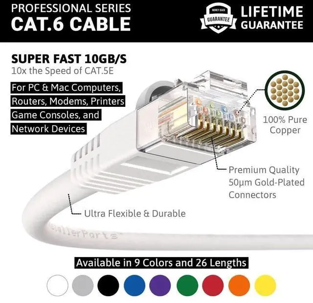 Our cables use high quality, long-lasting materials and feature A highly durable design at an affordable price. ^^ 50 Micron Gold Plated Contacts RJ45 plugs with 50 Micron gold plated contacts and molded strain relief boots provide secure network connection and durability. ^^ Maximum Compatibility Use the Cat6 patch cable to connect devices on a Local Area Network (LAN), such as laptops, PCs and Mac, network servers, printers, routers, switches, game consoles and more. TIA/EIA T-568B standard wiring. UL/CULl listed. RoHS comliant.